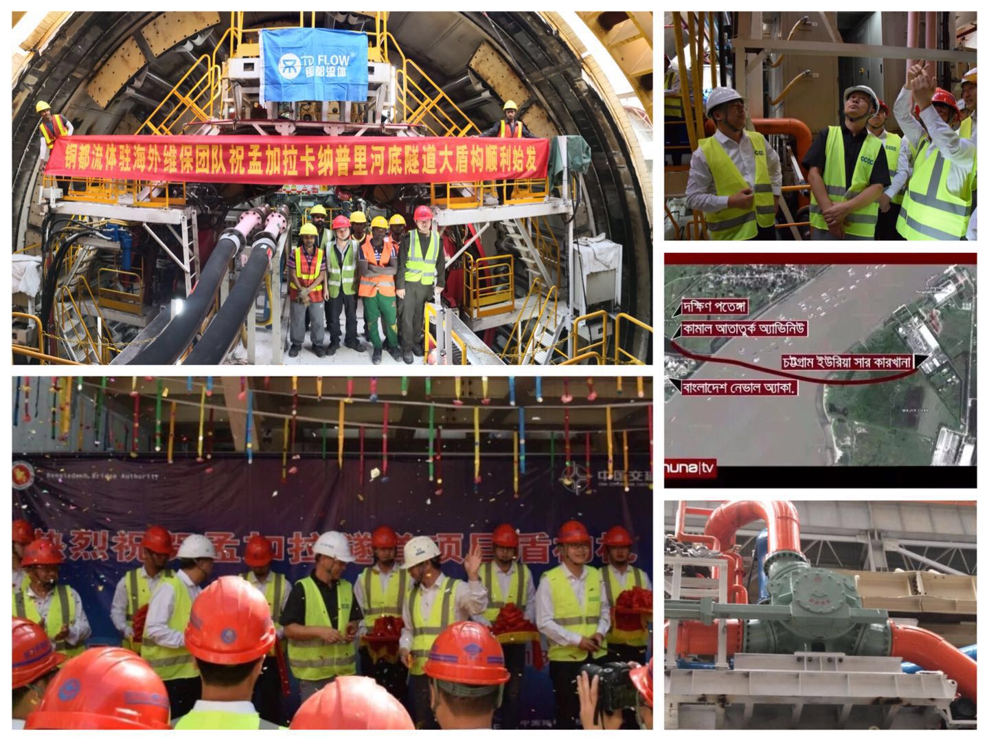 在該項目舉辦的盾構(gòu)機試運轉(zhuǎn)儀式上,中國駐孟加拉大使館經(jīng)參處李光軍參贊出席儀式并發(fā)表重要講話??{普里河河底隧道的建設(shè)不僅會改善孟加拉國國內(nèi)交通運輸狀況,同樣也將提升孟中印緬經(jīng)濟走廊建設(shè)以及該地區(qū)的互聯(lián)互通水平。該項目設(shè)計為雙向四車道,路線全長9265.971米,河底隧道工程總長3.5千米,其中盾構(gòu)段長度2450米,隧道覆土深度31米,設(shè)計水土壓力達0.59兆帕。這段工程以粉細砂地質(zhì)為主,極易發(fā)生砂層液化、刀盤結(jié)泥餅、切削面坍塌、排泥口堵塞等施工障礙,項目采用中交天和產(chǎn)Ф12.12m氣墊式泥水平衡盾構(gòu)施工。該盾構(gòu)機長94米、重2200余噸,是我國自主研發(fā)、出口海外首臺超大直徑泥水氣壓平衡盾構(gòu)機。